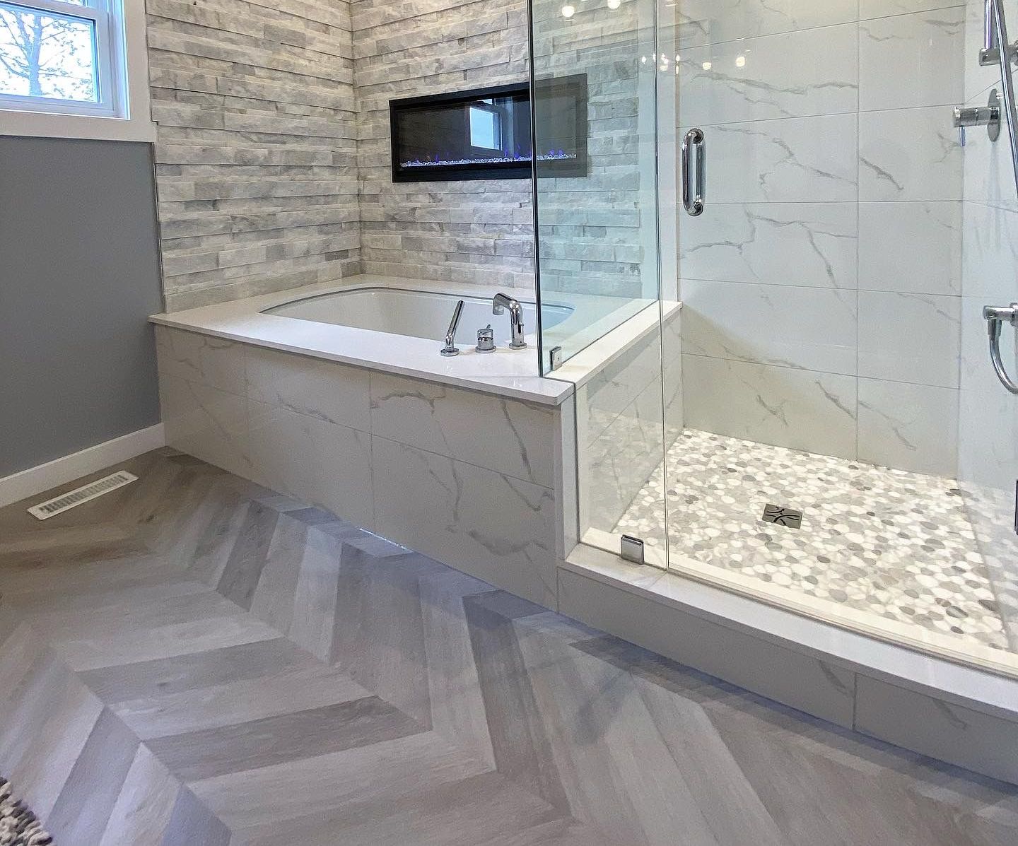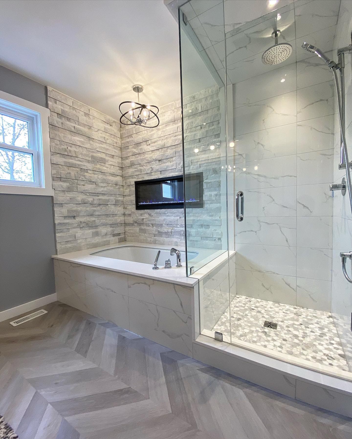 Who says you can’t have have a fire place in the bathroom!?. Awesome transformation for this half bathroom we completed in Courtice. #renovations #bathroomremodel #fireplace #envision #tile #glass #design #undermounttub #shower #tub #bathroomrenoButton