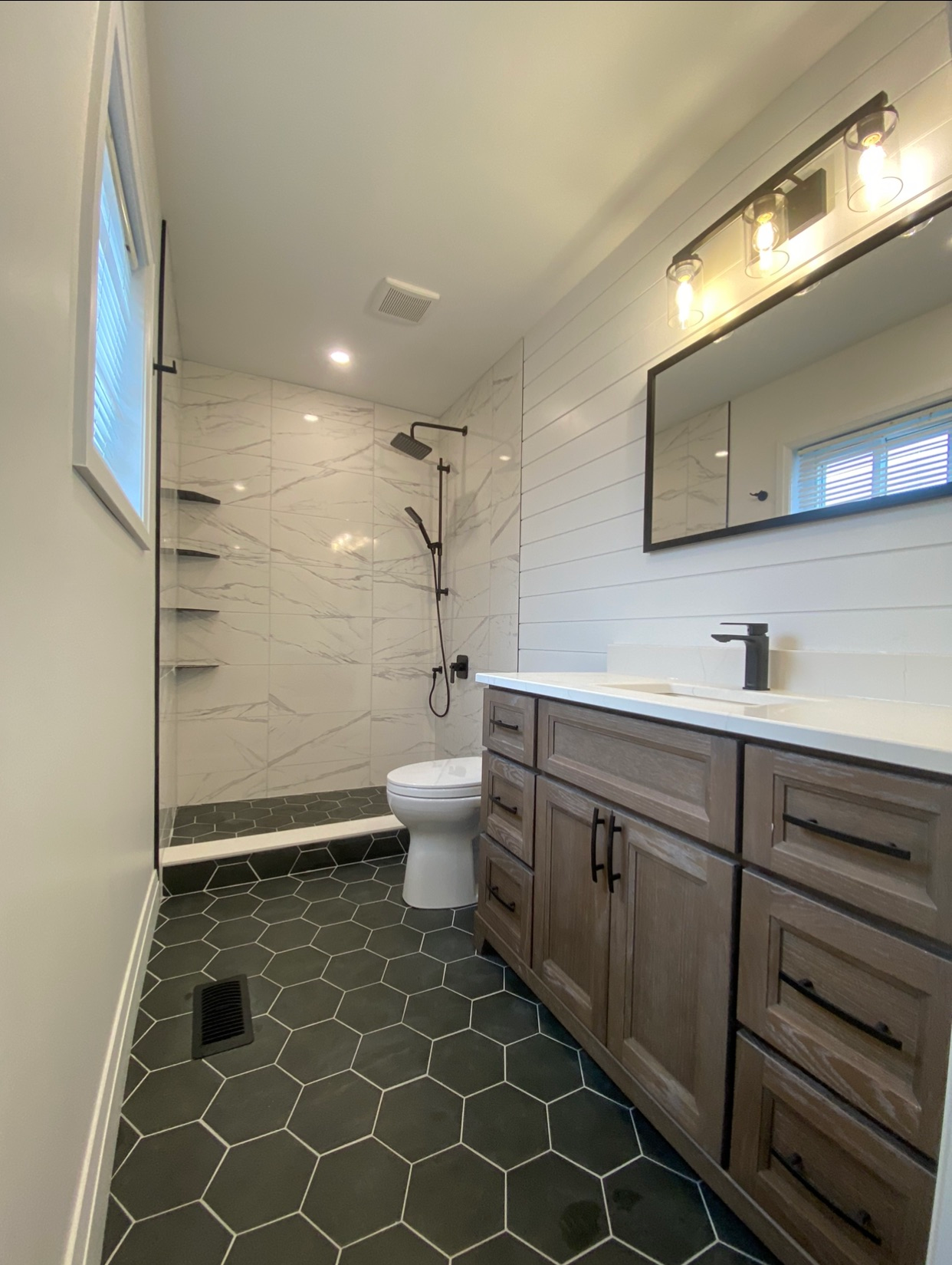 Told myself I would start posting more pictures this year, as we go. Sweet bathroom reno in Brooklin completed, swipe for before! Love the way it turned out, the heated floors are a really nice touch as well. #bathroom #bathroomreno #shower #tile #heatedfloors #hexagontile #blackfinishing #renovation #shluter #vanity #envisionButton