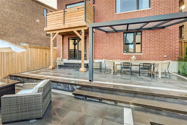 Full project complete in Brooklin, front back and side #designgame. PT fence, #cedar structure, @inlitedesign lights throughout back and front, @techobloc polished grande, blu, and raffinato in back, Maya Slabs for side, @oakslandscapeproducts Villanova driveway with some natural stone for porch and steps and garden. Irrigation throughout front and back #build #envision #happyclients #woodandstone #irrigation #onestopshop #workviews #driveways 👌#backyard #transformation #design #outdoorlivingButton