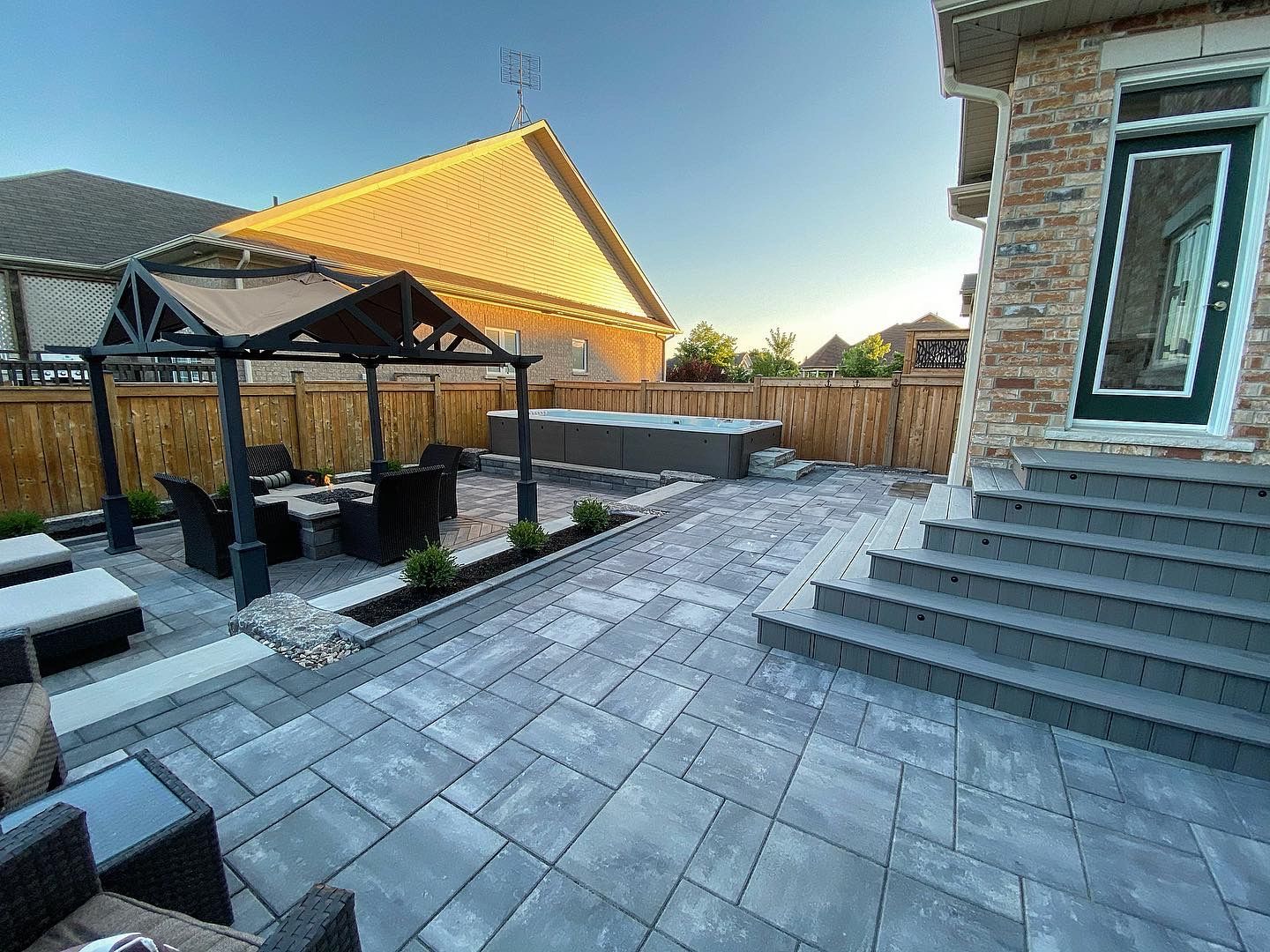 Awesome backyard completed in Bowmanville. Great entertaining space for many years to come. Check the #uvision render, pretty much nailed it! Thanks @peregrinemechanical for the gas hook ups for our @warmingtrends fire feature. @unilock throughout, with @inlitedesign for lighting #backyard #backyardreno #backyardliving #stone #fire #lights #firepit #hottub #design #build #envision #summerliving #uvision #beaconhill #granitefusion #brusselsblockButton